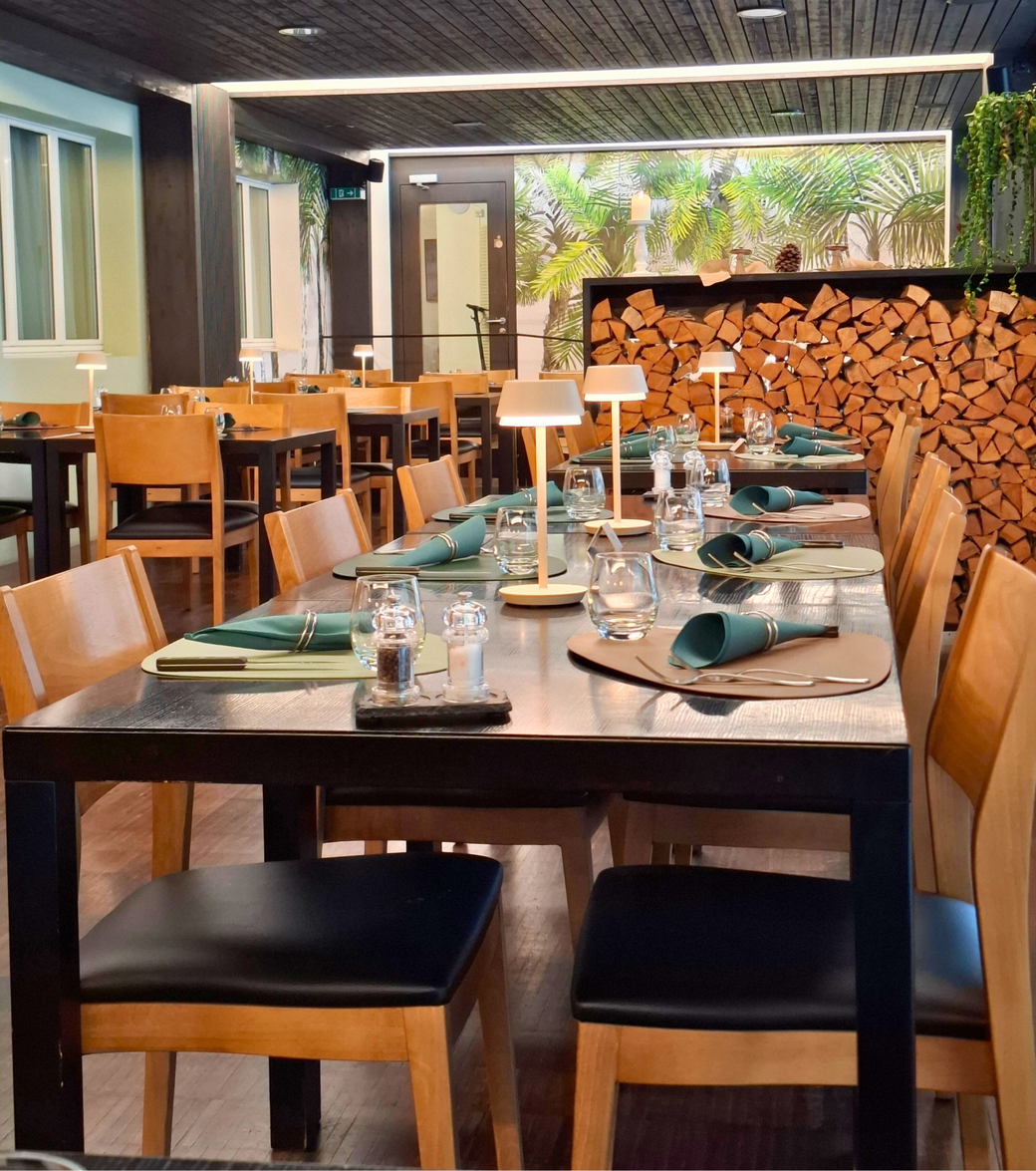 Der stilvolle Restaurantbereich des Hotel Restaurant Alpina besticht durch seine moderne Einrichtung und die rustikalen Holzelemente. Direkter Zugang zur überdachten Terrasse und zum Hotelbereich. Dieser Teil des Restaurants bietet Platz für 60 Personen.
